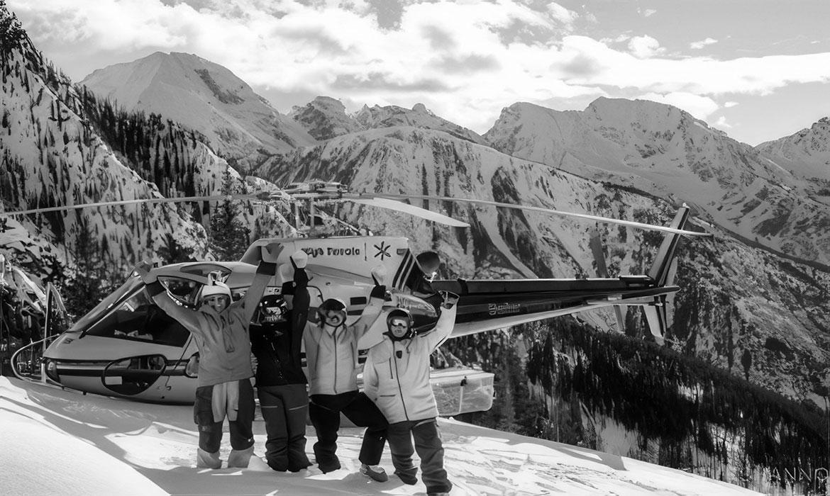 Small group heli skiing deep in the Kootenay region of BC, Canada. Selkirk and Purcell Mtn ranges.